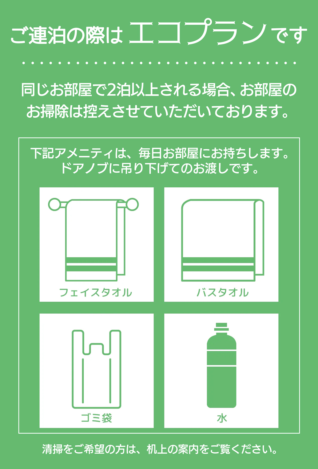 長期連泊時は、6 日目ごとに清掃させていただきます。このときエコプランはご利用いただけません。