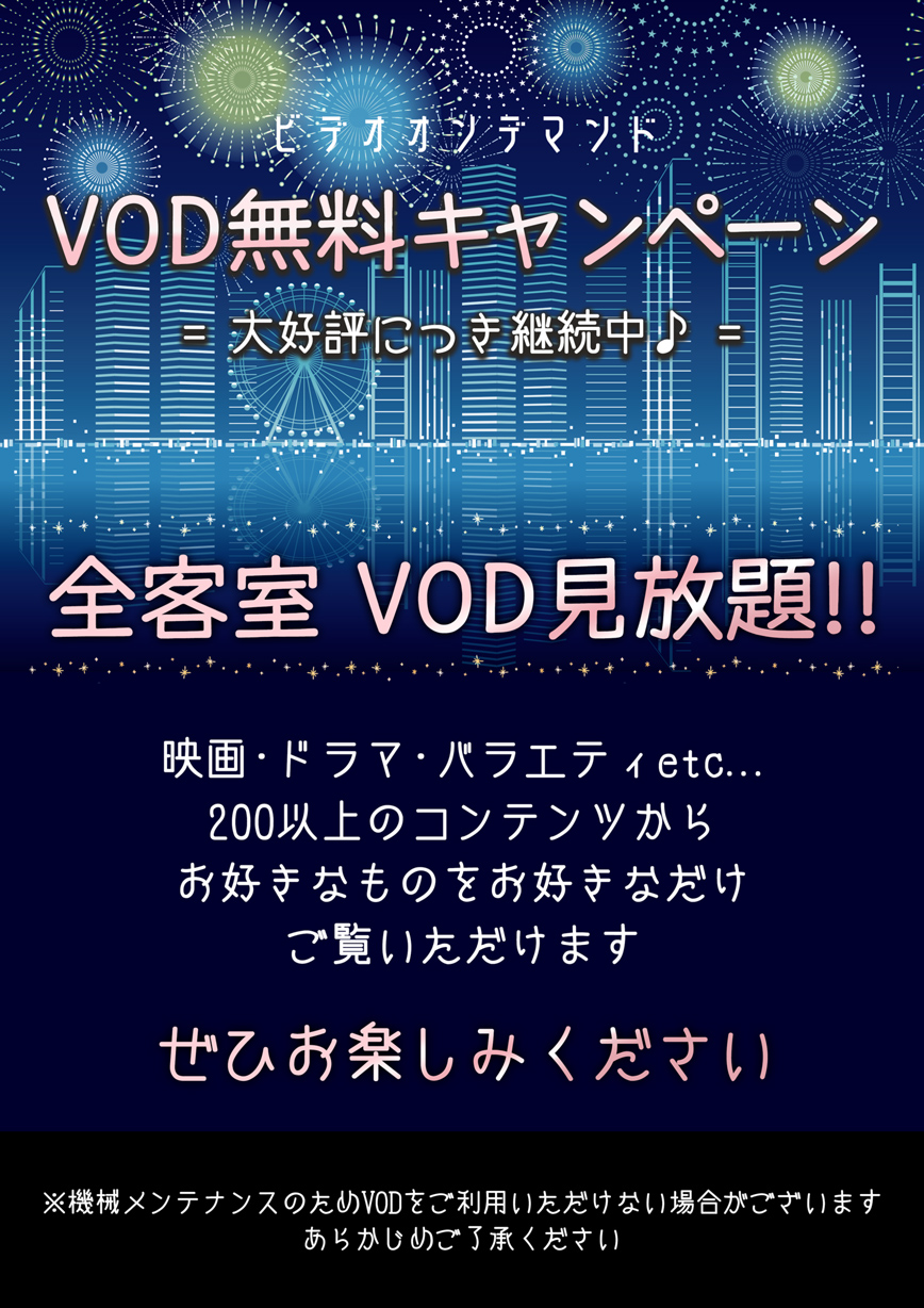 現在、当ホテルでは「【無料】VOD見放題キャンペーン」実施中です。