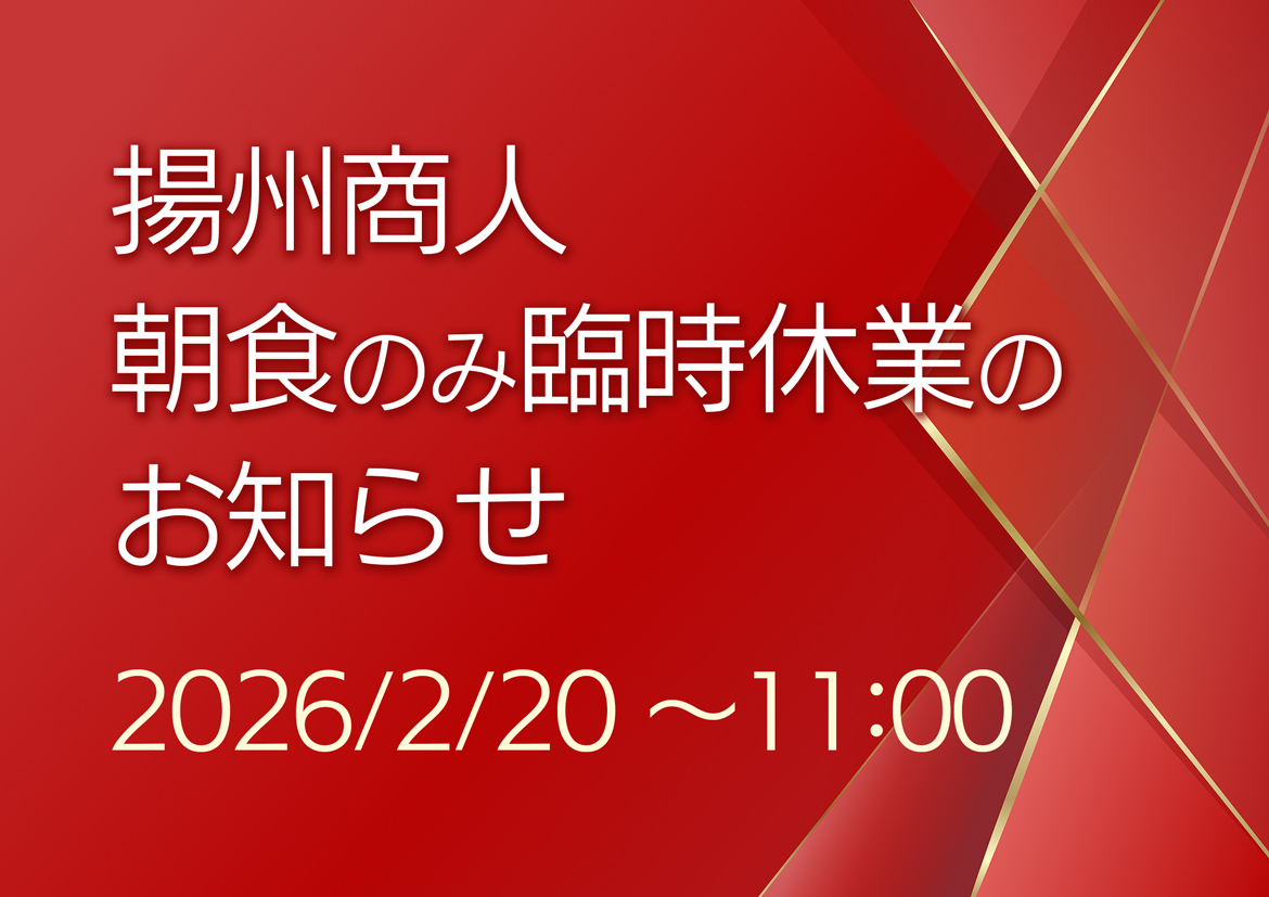 ●2026年2月20日(金) 揚州商人の朝食営業を休止いたします● 大変ご迷惑をお掛けしますが、朝食券をお持ちのお客様は、コメダ珈琲店・ファミリーマート・すき家よりお選びいただきますよう、お願い申し上げます。 揚州商人は […]